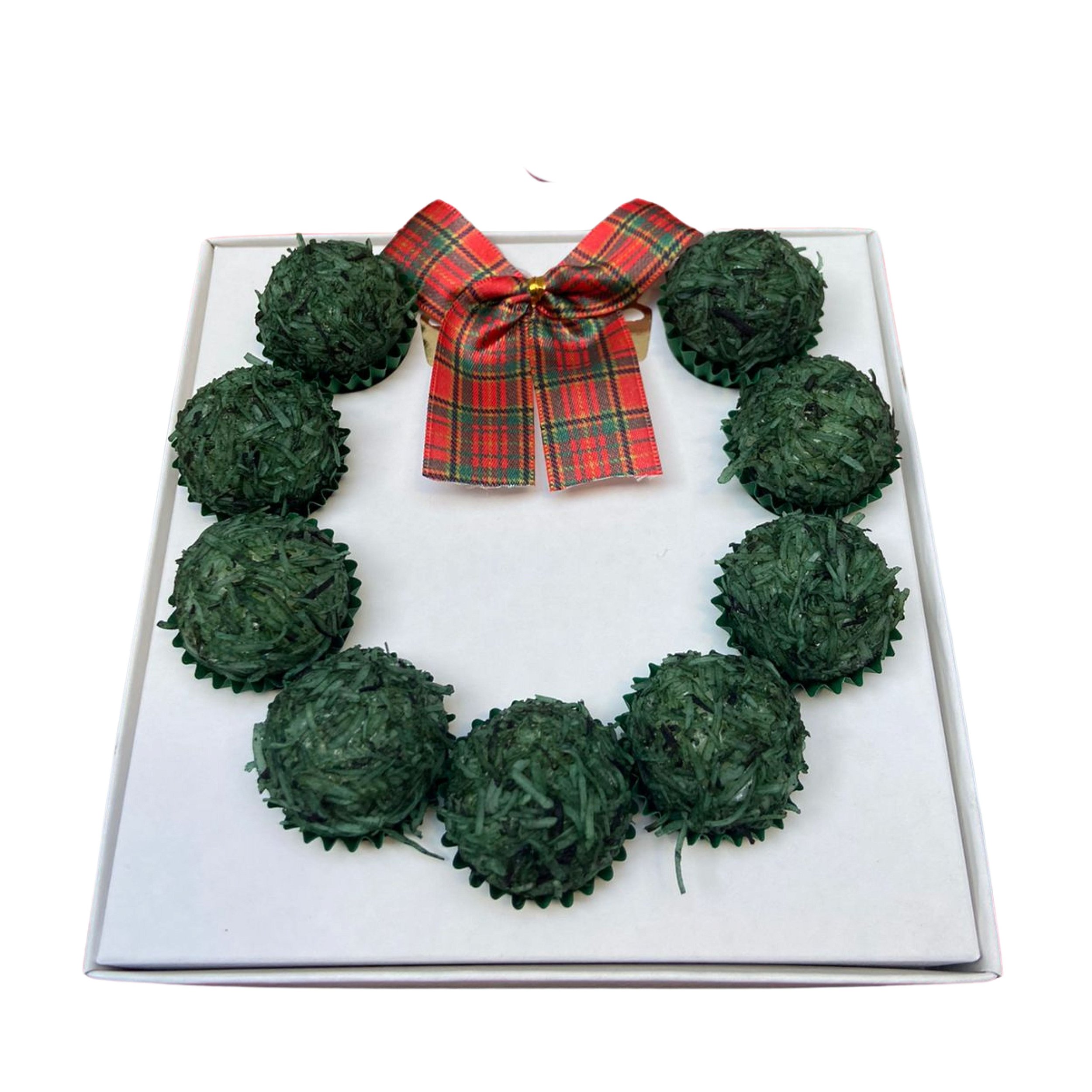 Caixa guirlanda de doces, com espaço livre para aplicação de laço de cetim ou de sua preferência. Acompanha berço para 9 doces de 17 a 20 gramas. Tampa em acetato transparente.