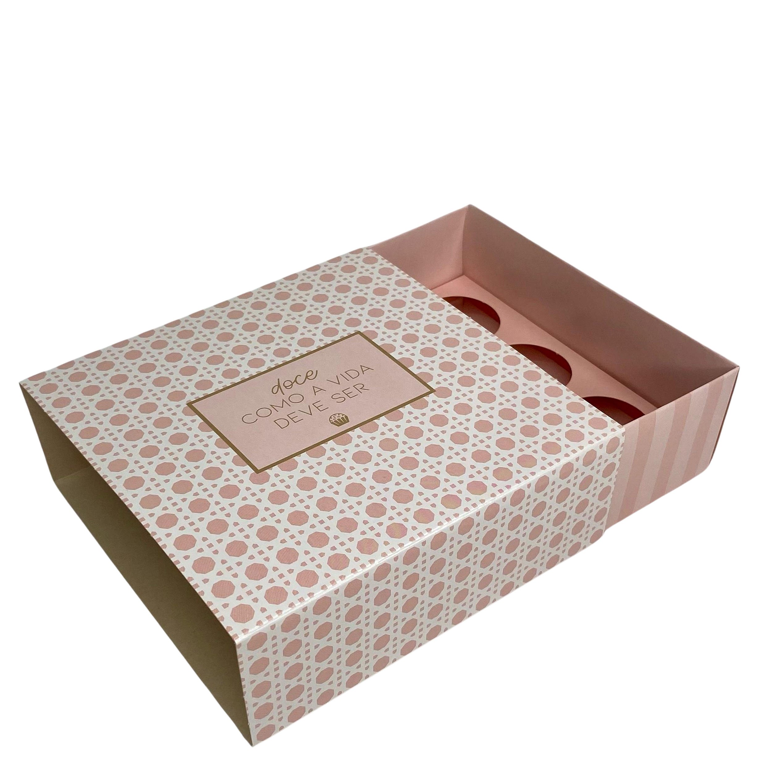 para 9 docinhos, possui um design sofisticado e um puxador que facilita a abertura e o manuseio.