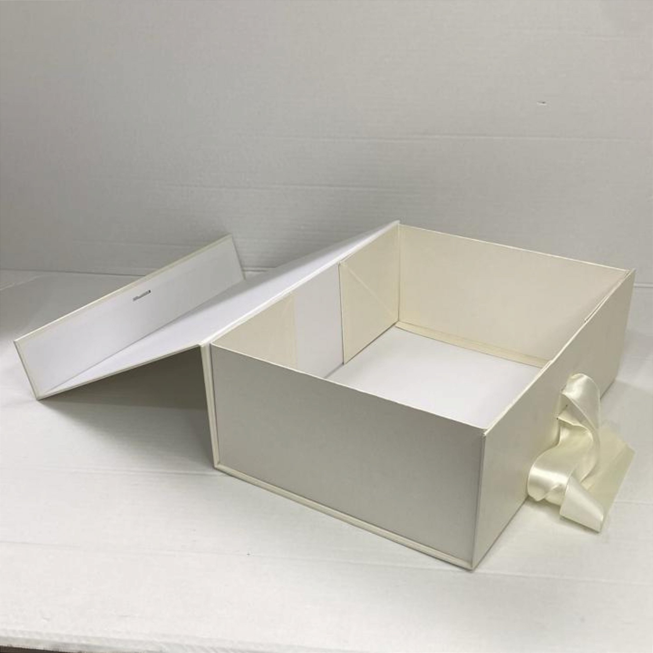 Caixa rígida dobrável com fecho magnético e fita de cetim.